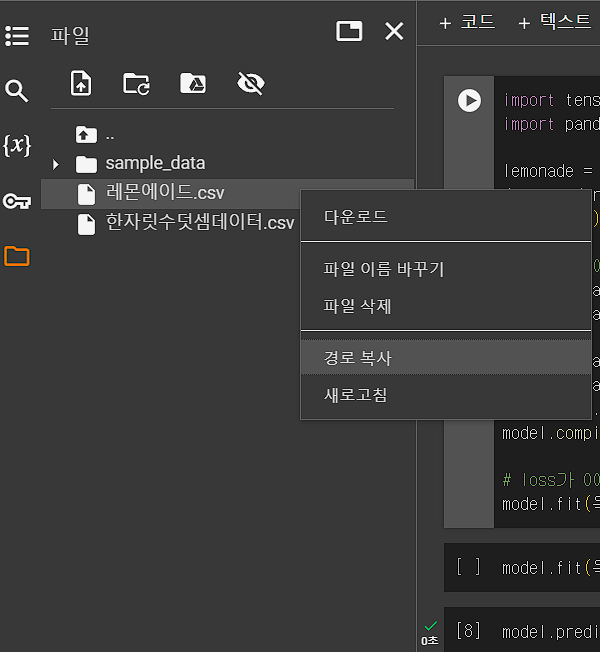 파일 경로는 파일을 Colab에 드래그해 넣고, 우클릭 후 경로 복사를 누르면 된다.