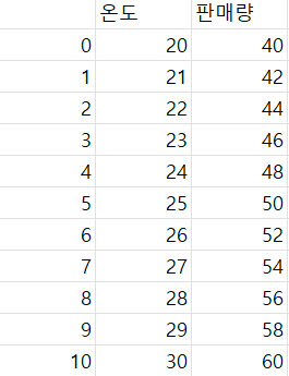 추후 결과 값이 얼마나 정확한지 판단하기 위해, 온도가 증가함에 따라 판매량이 2배씩 증가하도록 데이터를 작성하였다.